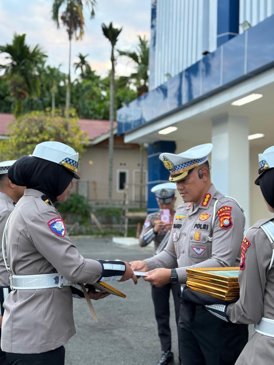 Mapos, Mamuju – Untuk mendorong kinerja personelnya tetap optimal, Dirlantas Polda Sulbar Kombes Pol Wahid Kurniawan dalam pelaksanaan apel rutin kembali memberikan reward kepada personel yang berprestasi, Kamis (5/6/25) di gedung BPKB Ditlantas Polda Sulbar.