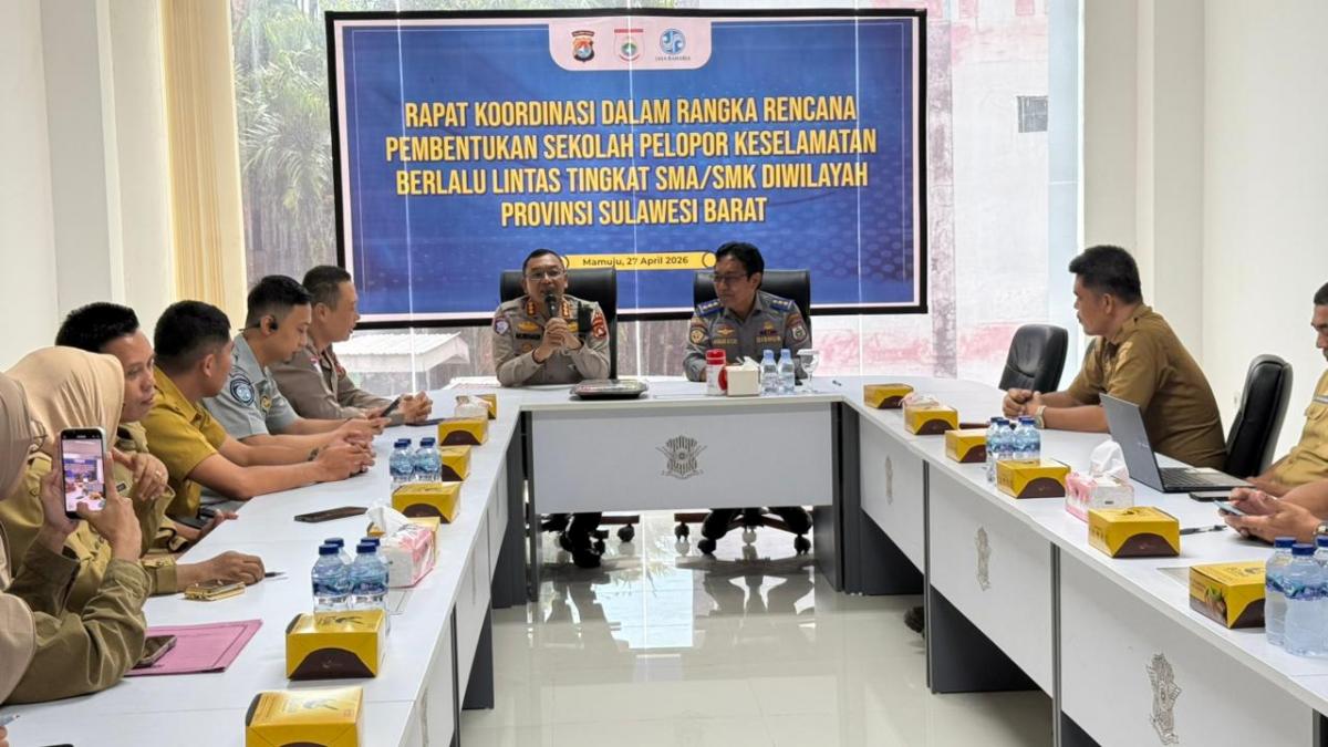Pertemuan ini bertujuan membentuk program Sekolah Pelopor Keselamatan Berlalu Lintas khusus bagi siswa tingkat SMA/SMK yang dilaksanakan di Ruang Rapat Lantai 3 Gedung BPKB Ditlantas Polda Sulbar, Senin (27/4/26).