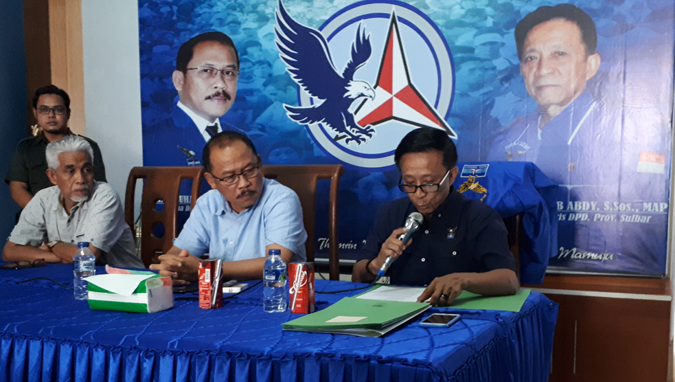 Sekretaris DPD Partai Demokrat Sulbar, Abdul Wahab Abdy, membacakan satu per satu SK yang terbit dari DPP Partai Demokrat. Didampingi Ketua DPD Partai Demokrat Sulbar, Suhardi Duka (tengah) dan Bendahara DPD Partai Demokrat Sulbar, Abubakar Badjeber