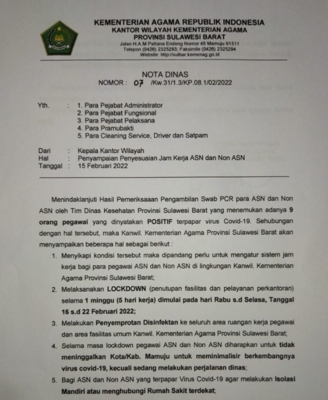 Kakanwil Kemenag Sulbar Dr.Muflih B Fattah mengeluarkan Instruksi melalui Nota Dinas yang berisi 6 poin himbauan antara lain, penyesuaian jam kerja, Lockdown selama satu pekan ke depan. Dimulai hari ini Rabu,16 sampai dengan Selasa, 22 Februari 2022. Kemudian akan dilakukan penyemprotan disinfektan.