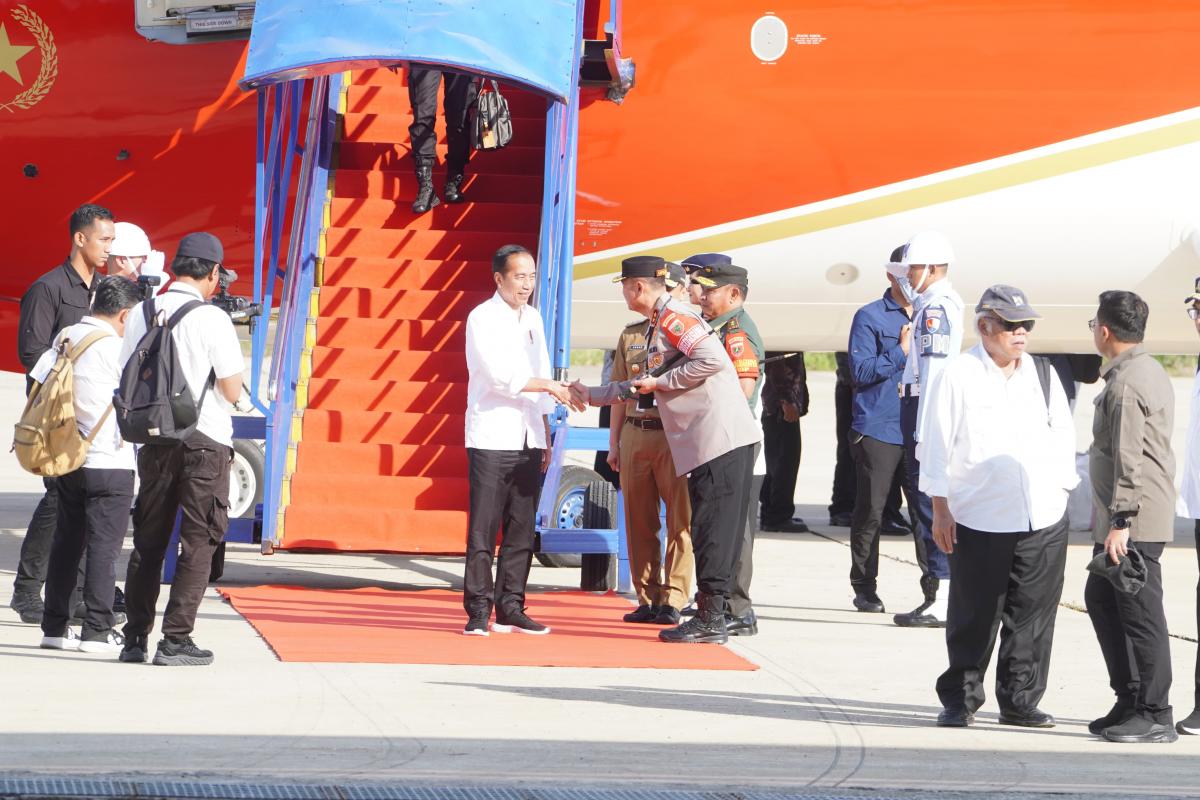 Mapos, Mamuju — Kapolda Sulbar Irjen Pol Adang Ginanjar bersama PJ. Gubernur, Danrem 142 Tatag, Ketua DPRD Sulbar dan forkopimda lainnya memberikan sambutan hangat kepada Presiden RI Joko Widodo saat tiba di Bandar Udara Tampa Padang Mamuju, Senin sore (22/2/24).