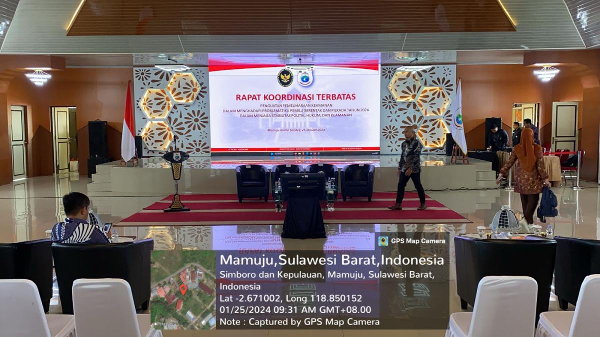 Mapos, Mamuju — Biro Umum Sekretariat Daerah Provinsi Sulawesi Barat (Setda Sulbar) memfasilitasi kegiatan Rapat Koordinasi Terbatas Penguatan Pemeliharaan Keamanan dalam menghadapi Problematika Pemilu Serentak dan Pilkada Tahun 2024 dalam menjaga Stabilitas Politik Hukum dan Keamanan di Sulbar, di Graha Sandeq, Kamis 25 Januari 2024.
