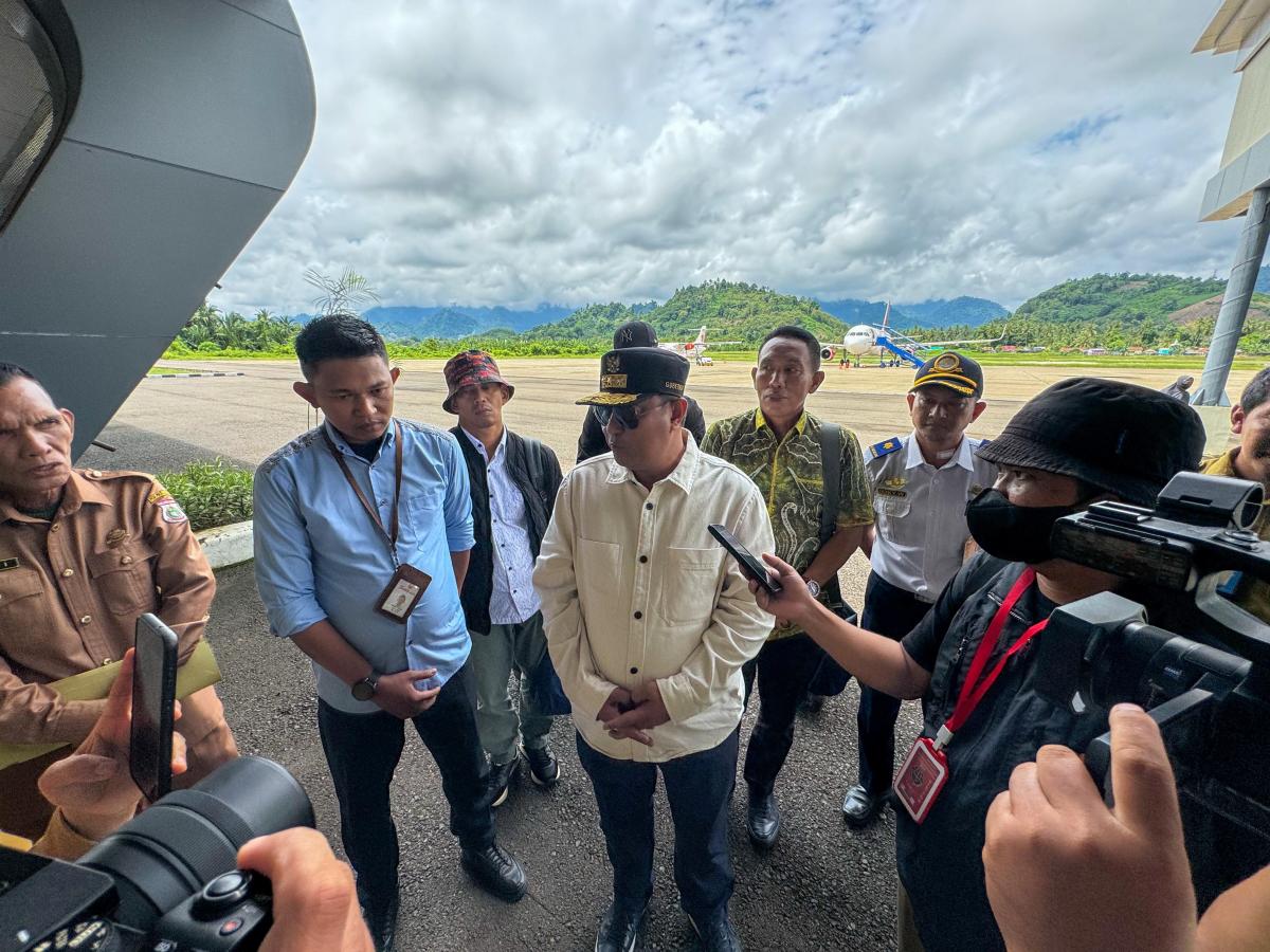 Mapos, Mamuju — Pj Gubernur Sulawesi Barat, Bahtiar Baharuddin didampingi Kepala Dinas Perhubungan Provinsi Sulbar Maddareski Salatin baru saja mendarat di Bandara Tampa Padang, Kecamatan Kalukku, Kabupaten Mamuju, Selasa (27/08/2024).