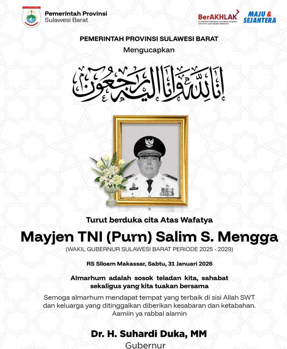 Kepergian Mayor Jenderal TNI (Purn) Salim Mengga menjadi duka mendalam bagi Pemerintah Provinsi Sulawesi Barat dan seluruh masyarakat. Almarhum dikenal sebagai sosok pemimpin yang berdedikasi, berintegritas, serta memiliki komitmen kuat dalam mendukung pembangunan dan stabilitas daerah.