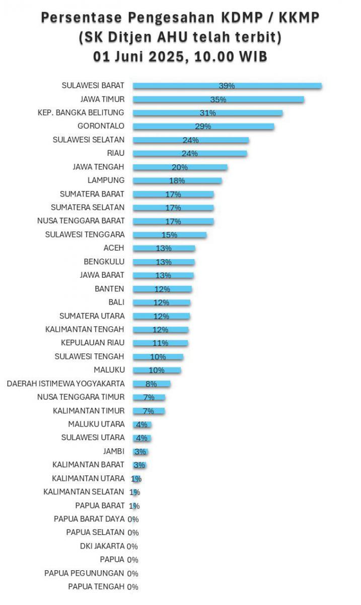 Direktorat Jenderal Administrasi Hukum umum (Ditjen AHU) Merilis data update pukul 10.00. Wib. Persentase pengesahan Koperasi Desa Kelurahan Merah Putih (KDMP) dan Koperasi Kelurahan Merah Putih (KKMP) hari ini, Ahad (01/06/2025).